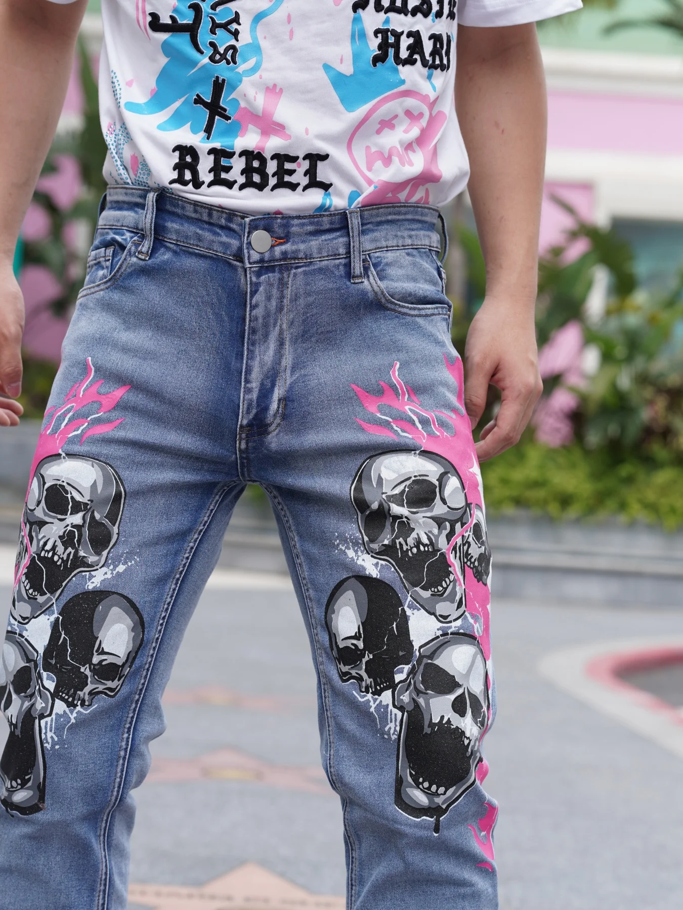 Men's Jeans With Fashionable Devil Print  High Waisted and Wide Leg Style  Enjoy Promotional Discount With Free Shipping